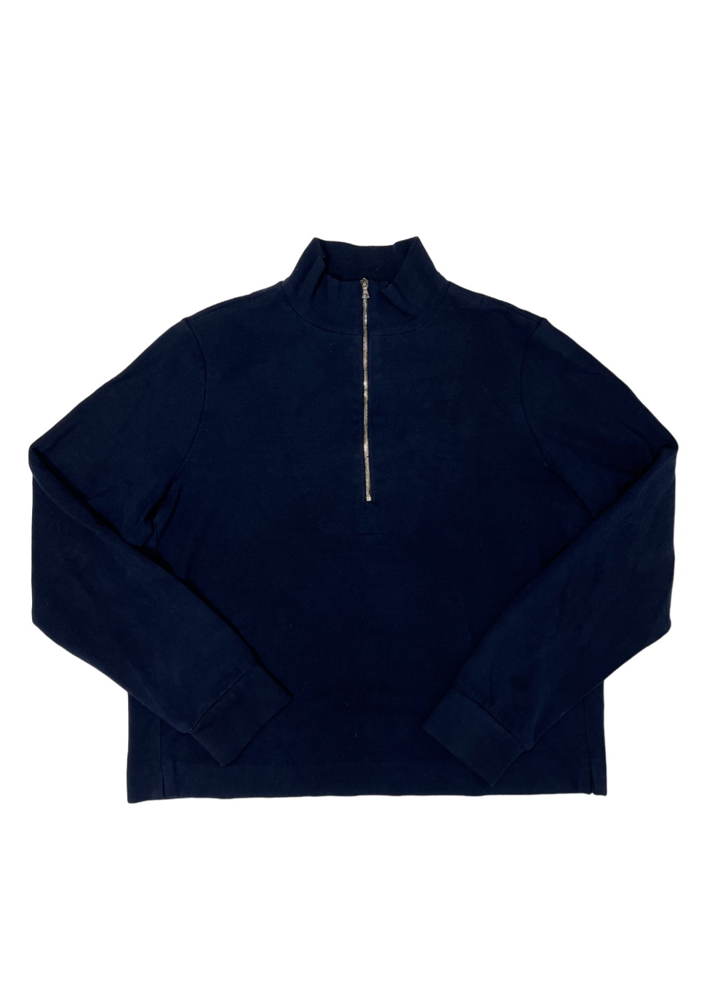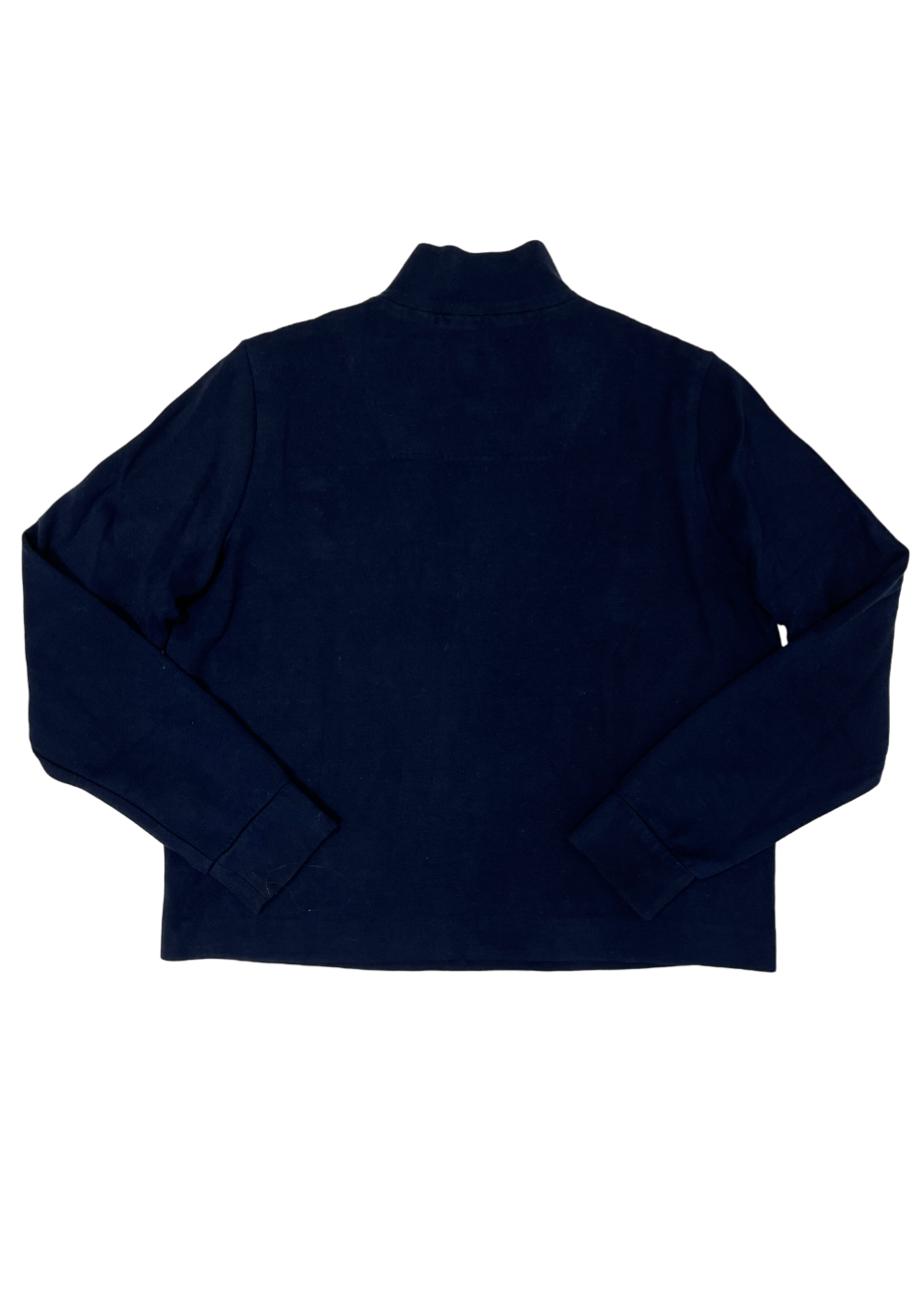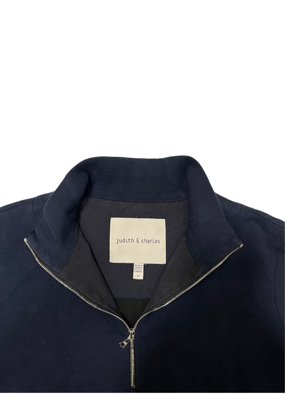 Women's 1/4 zip front pullover track jacket / sweatshirt in navy blue by Judith & Charles.