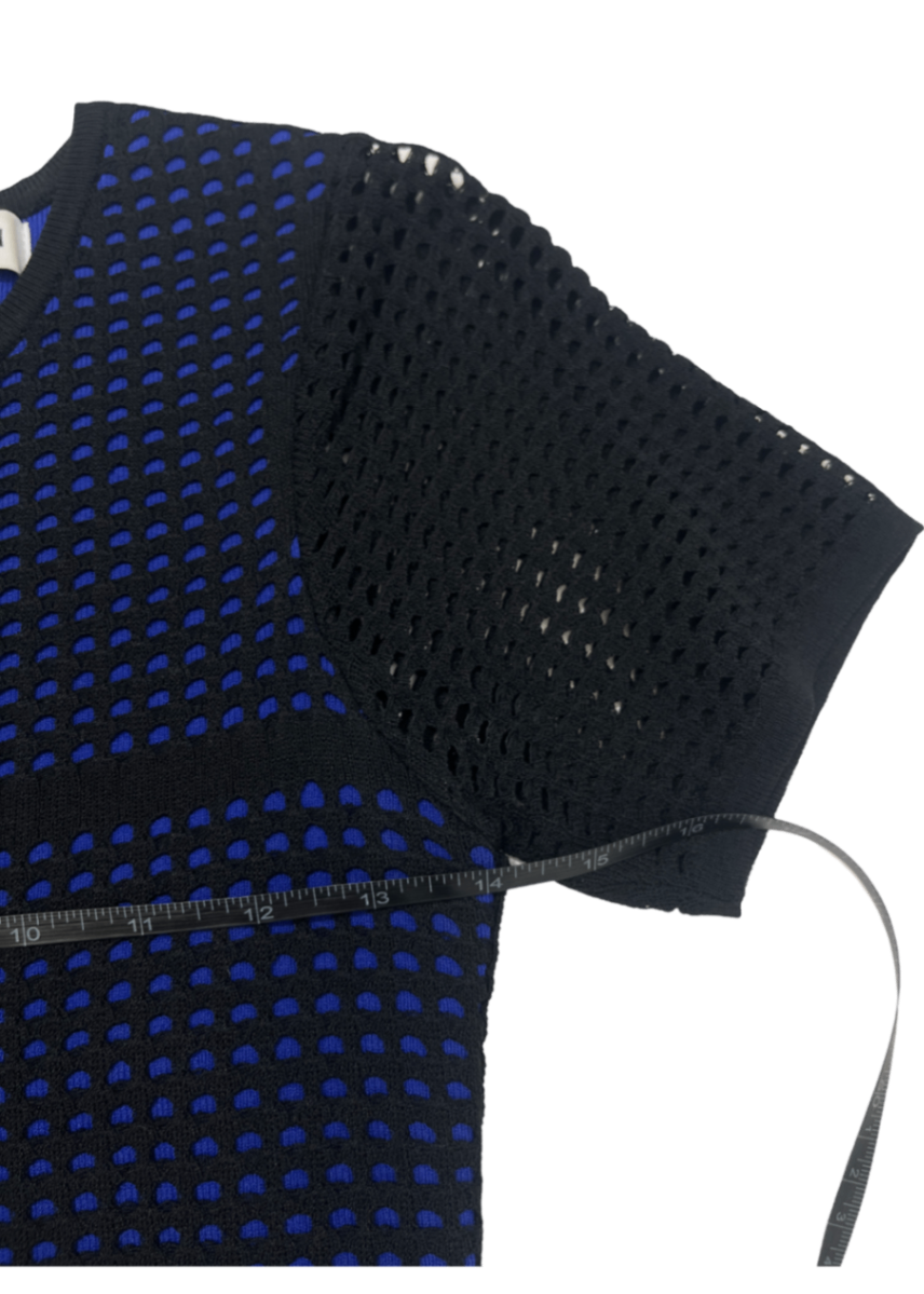 Women's short sleeve fitted dress with back zip by John + Jenn in bright blue with black netted overlay.