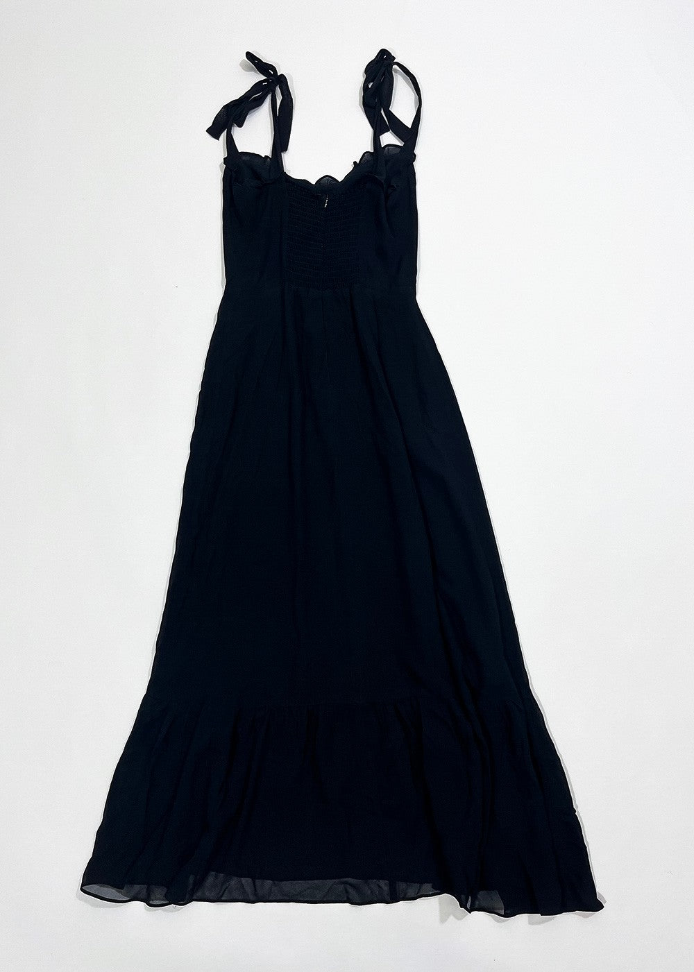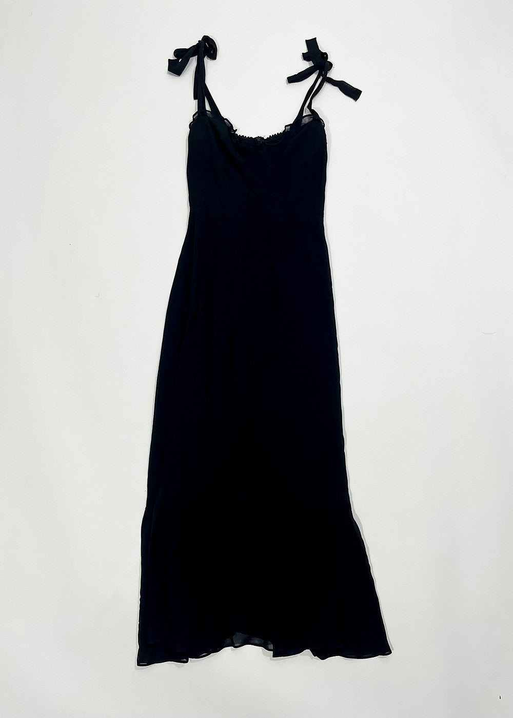 Women's black midi length 'Nikita' dress by Reformation featuring ruffle edged neckline, adjustable strap ties and a trumpet skirt.