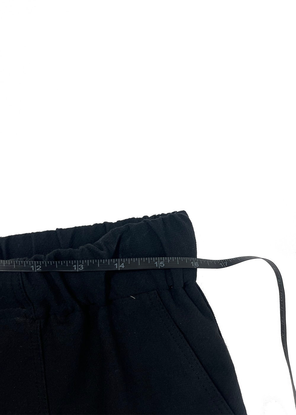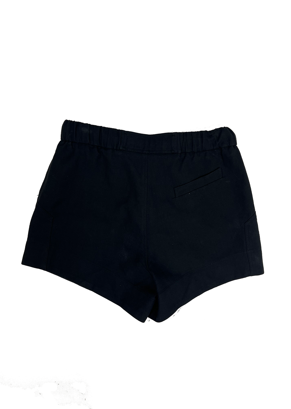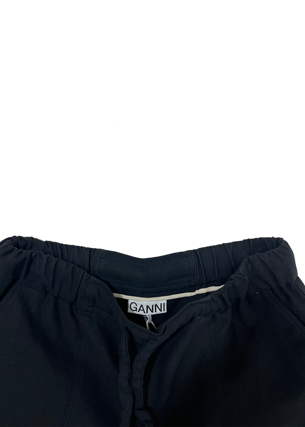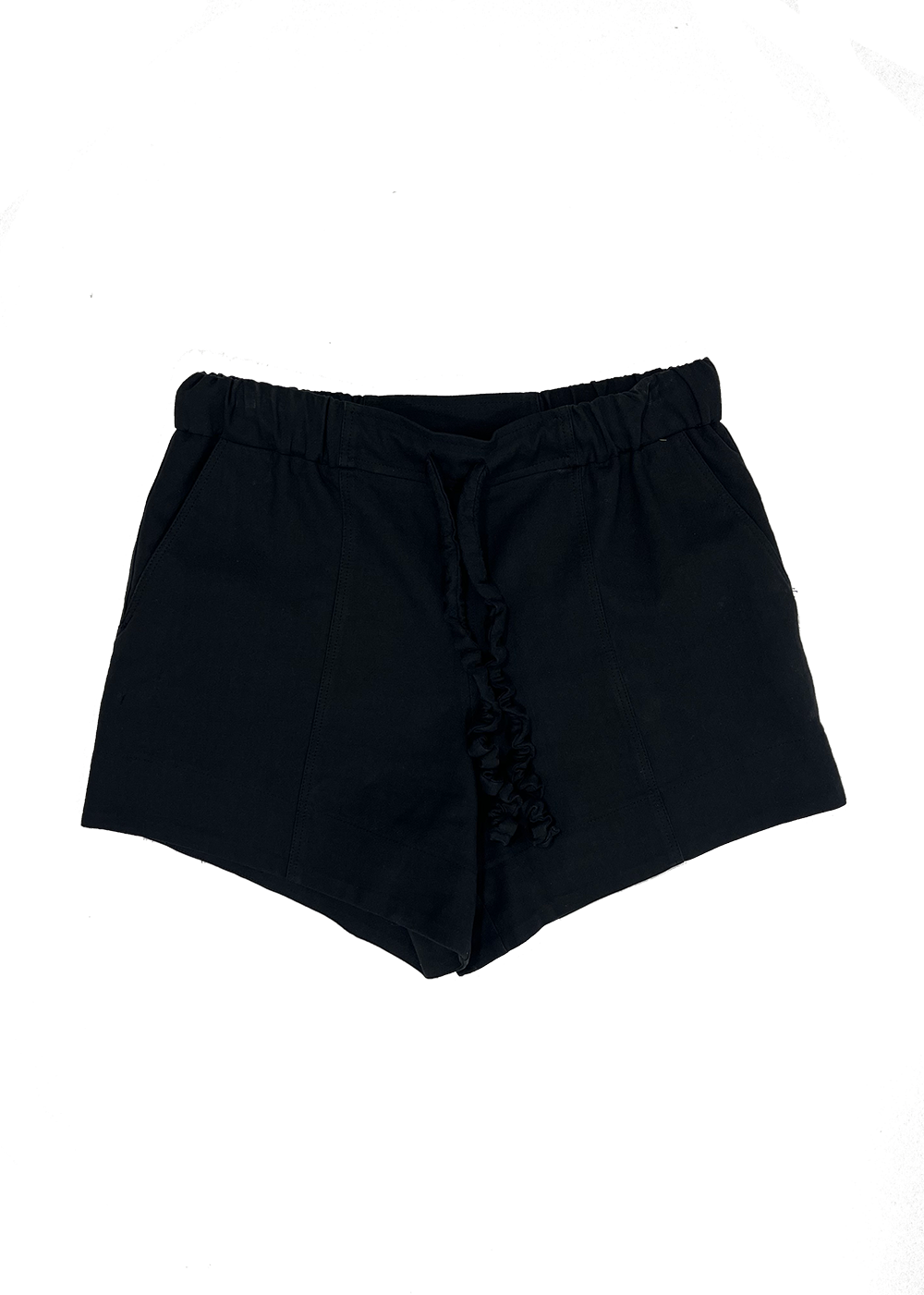 Women's black organic cotton shorts with drawstring at elasticized waist and side pockets.