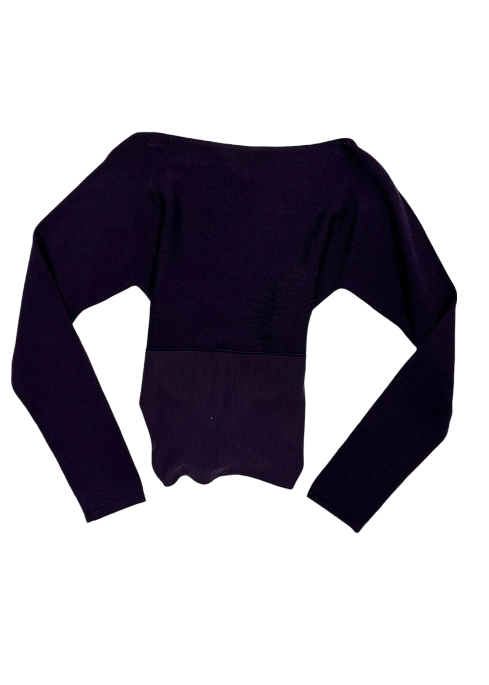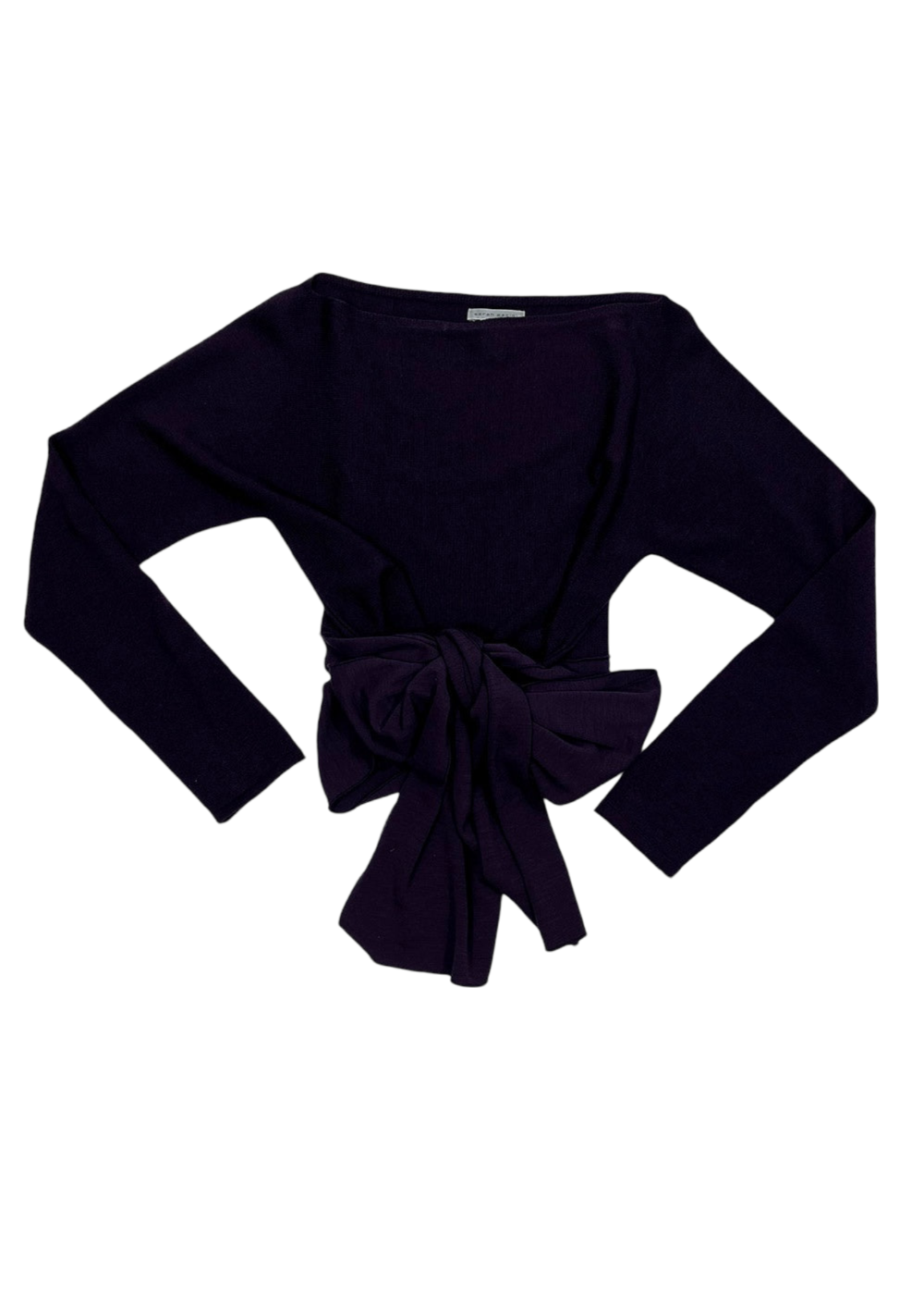 Women's crewneck sweater in dark purple features a self-tie wrap detail and long sleeve, made in Italy by Sarah Pacini.
