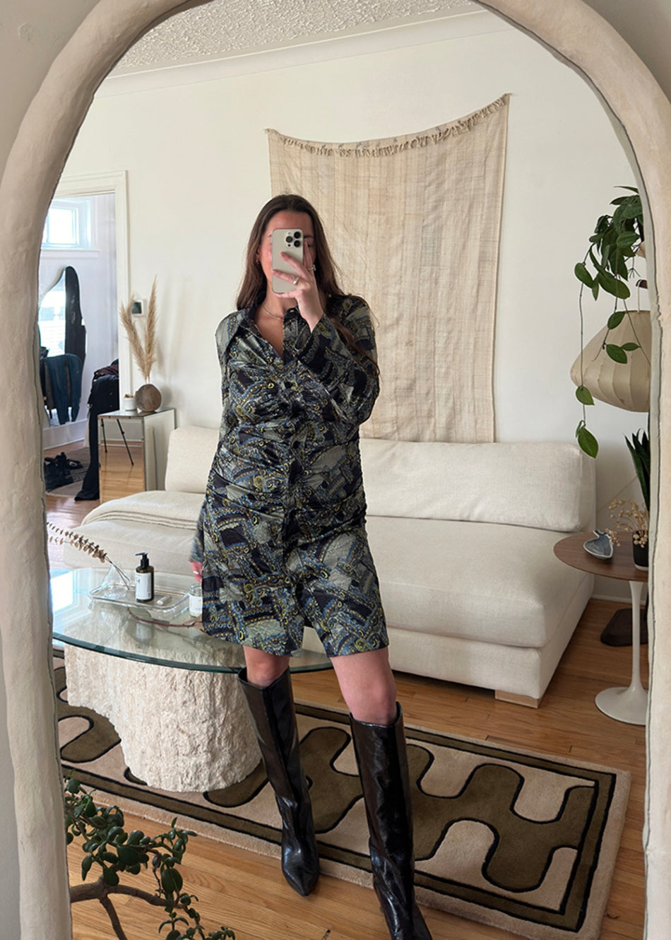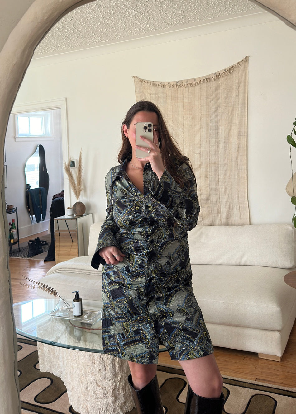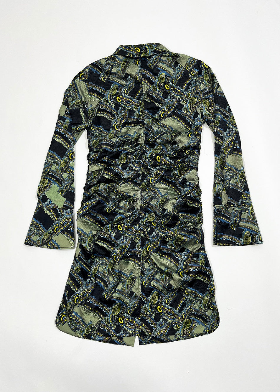 Crinkled Satin Paisley Shirt Dress / Size 38
