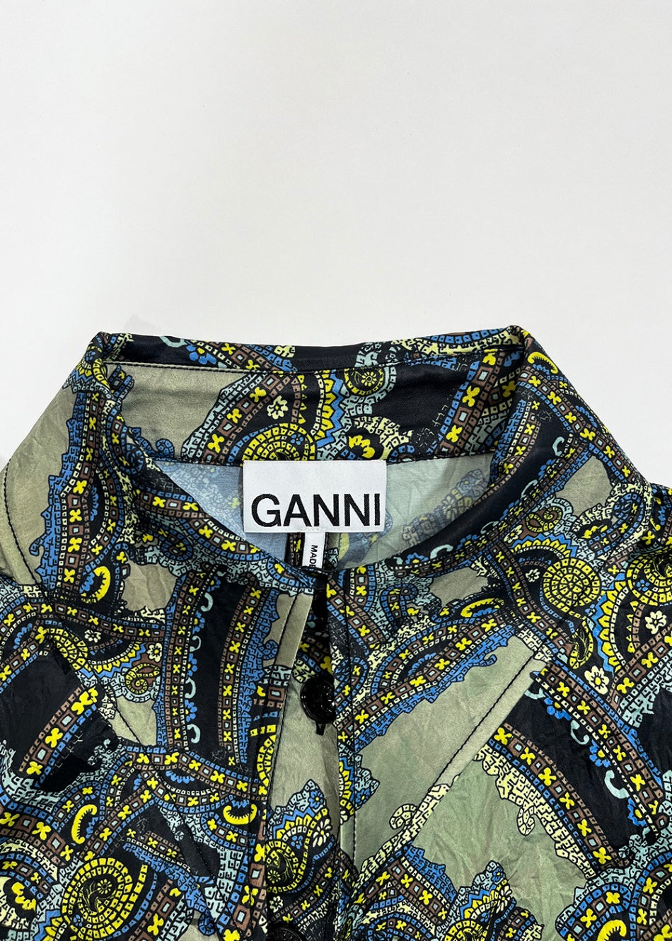Women's printed paisley button-up shirt dress with exaggerated collar by Ganni in crinkle satin stretch fabric.