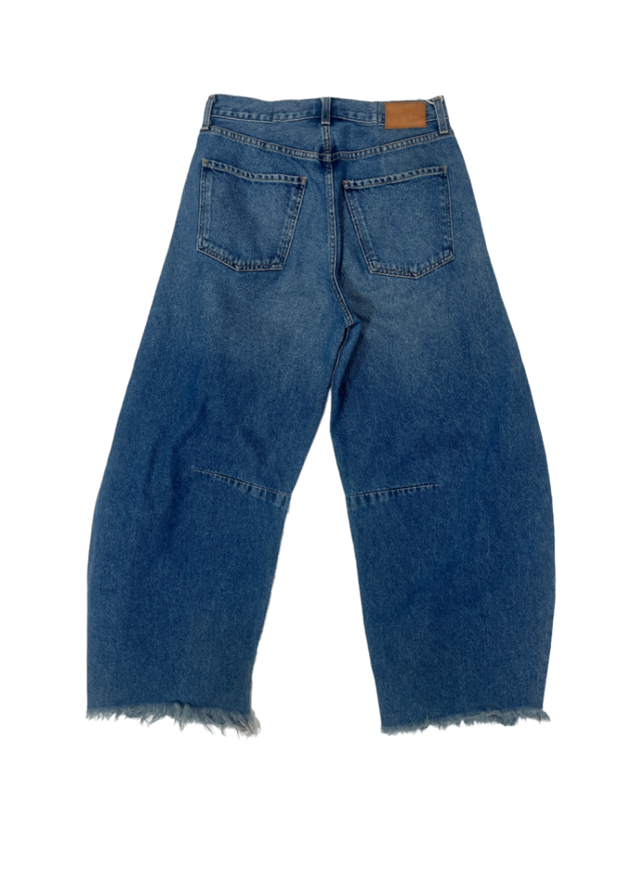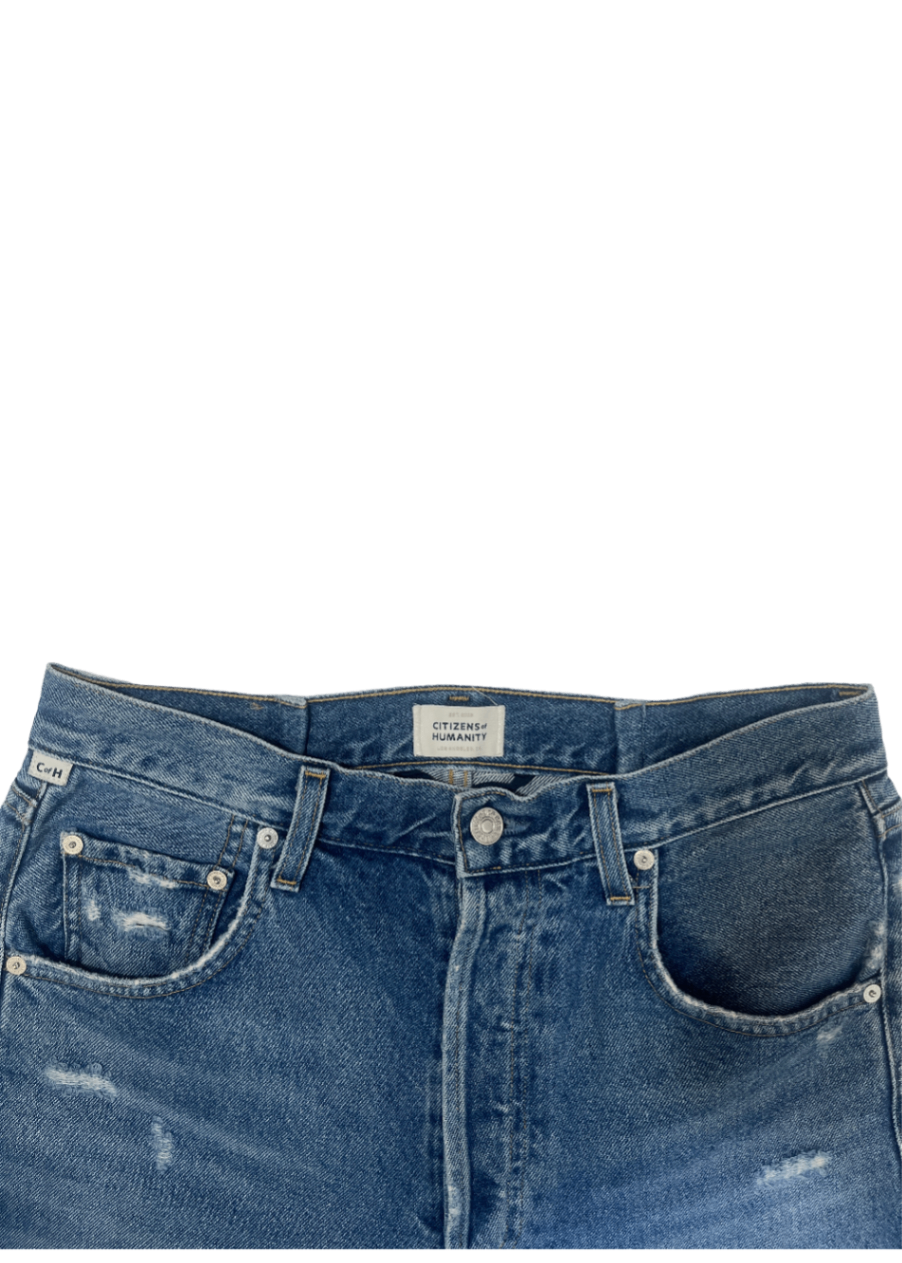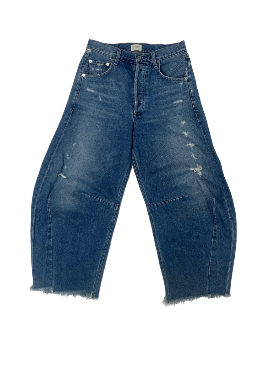 Women's horseshoe jeans in a mid-blue 'Magnolia' wash feature a high-rise and zip fly, made in USA by Citizens of Humanity.