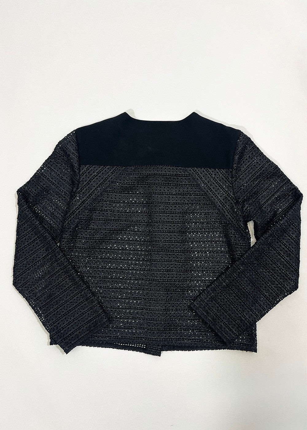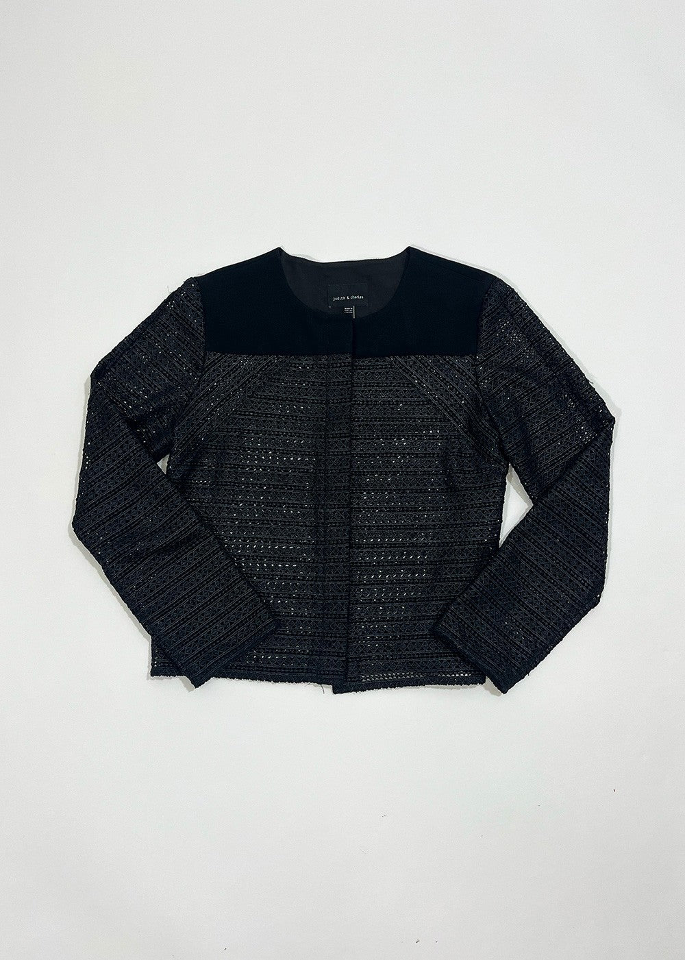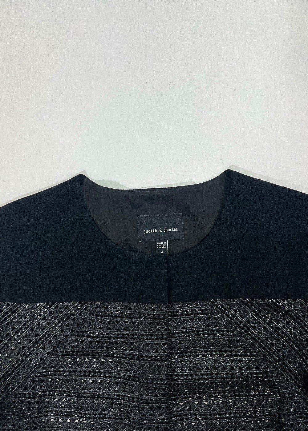 Women's coated lace front/sleeve blazer in black by Judith & Charles with hidden front button closure and polyester trim details.