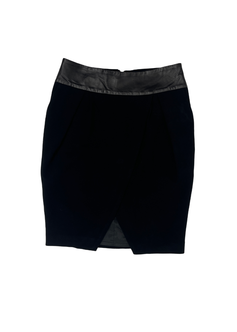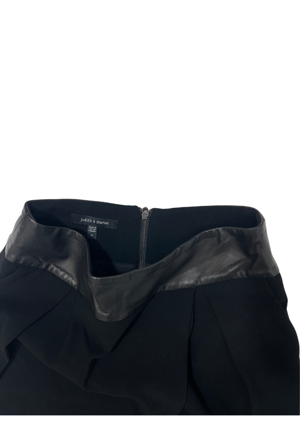 Women's mini skirt in black with split front detailing and leather waistband by Judith & Charles.