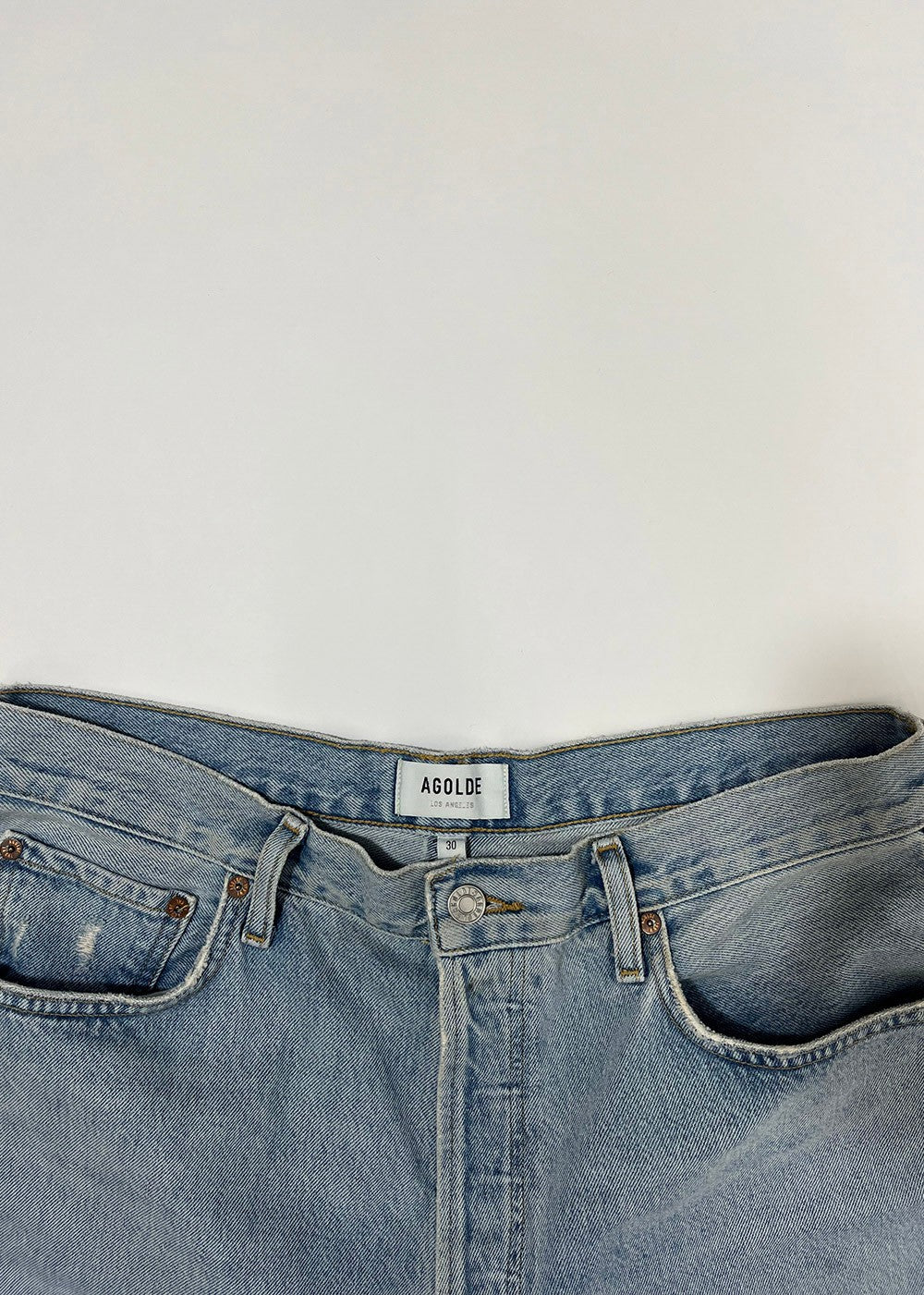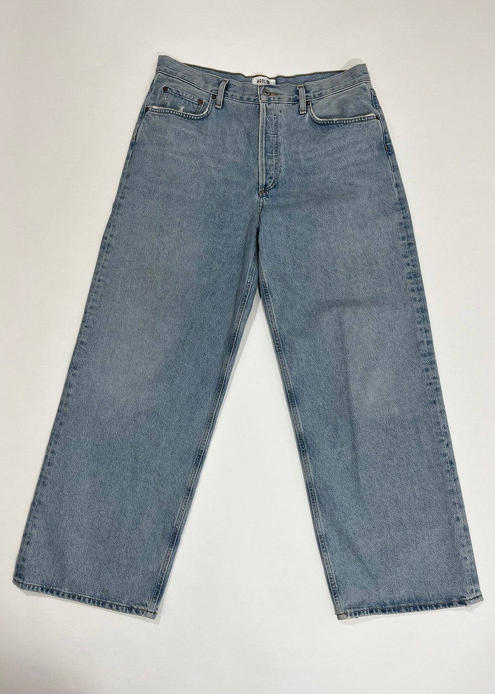 Women's low slung baggy jean from AGOLDE feature a relaxed leg and button fly, made in USA.