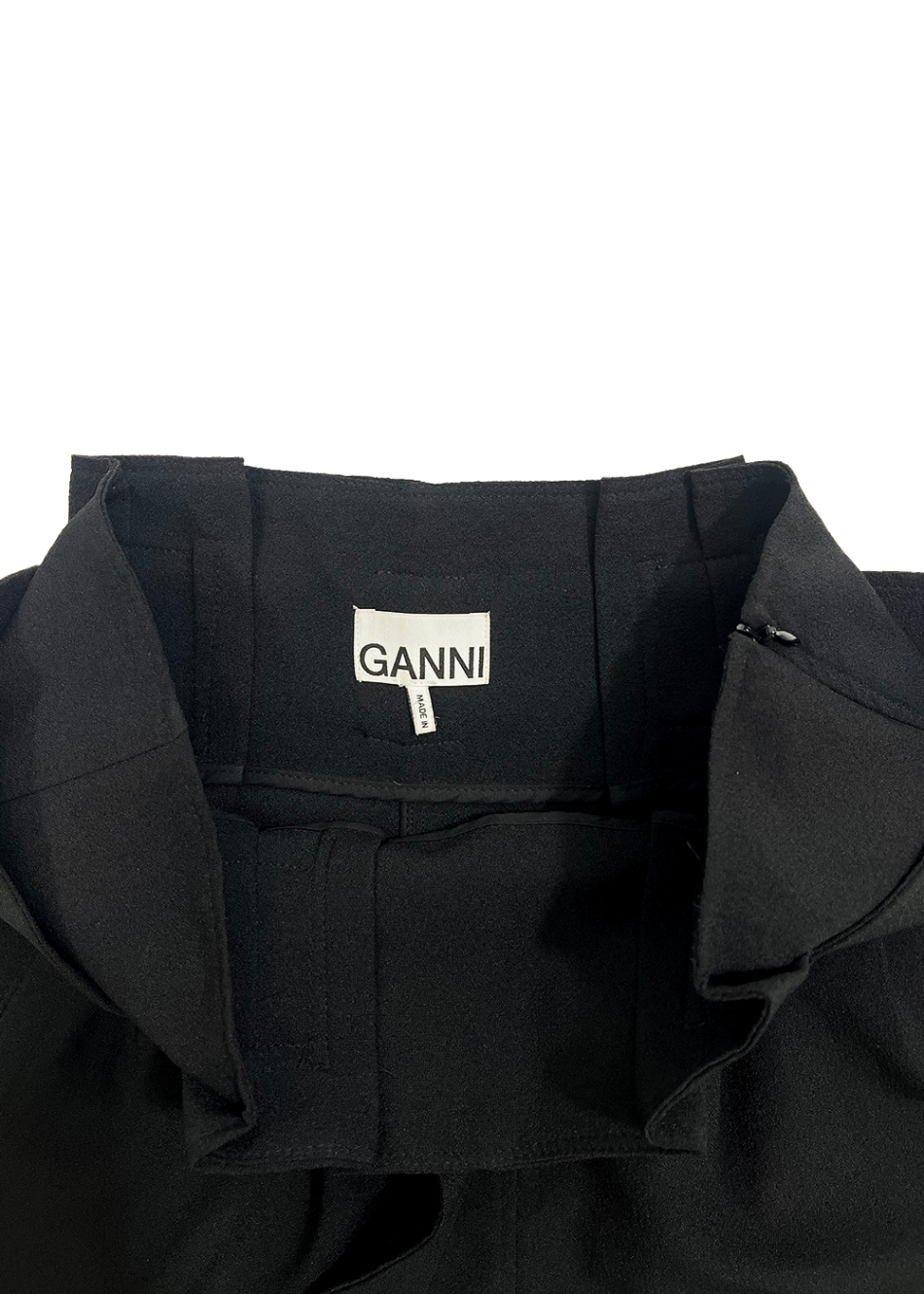 Women's black Ganni shorts feature a paperbag waist, creating a flattering, feminine silhouette. Crafted from crepe containing recycled fibres, they're cut with front pleats and side pockets, then cinched with a silver buckle-fastened belt.