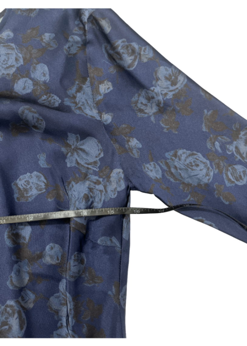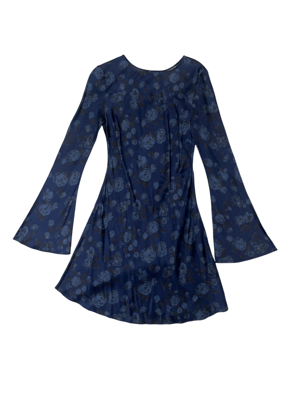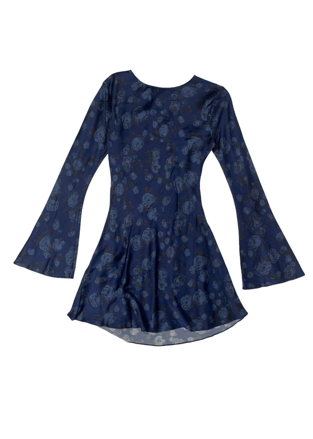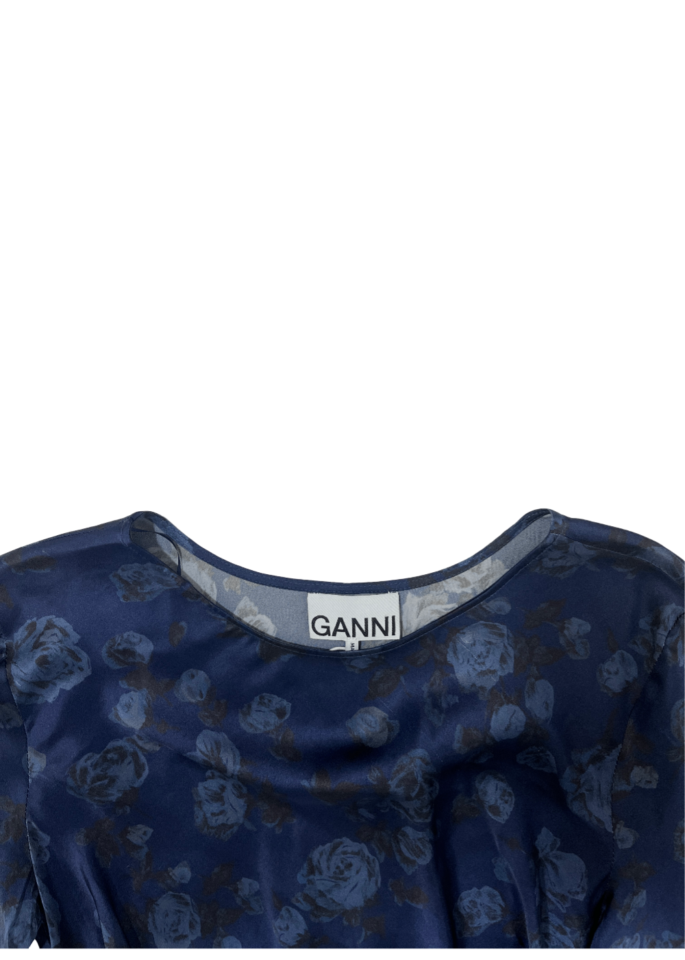 Women's long sleeve printed satin mini dress in navy floral by GANNI.