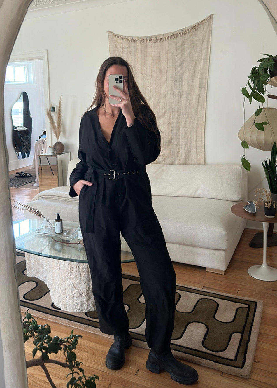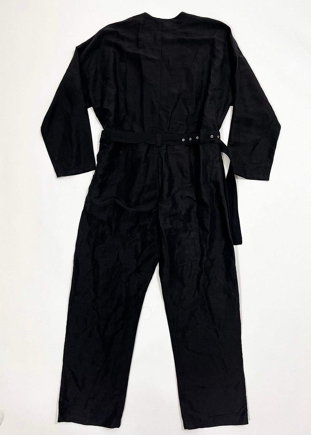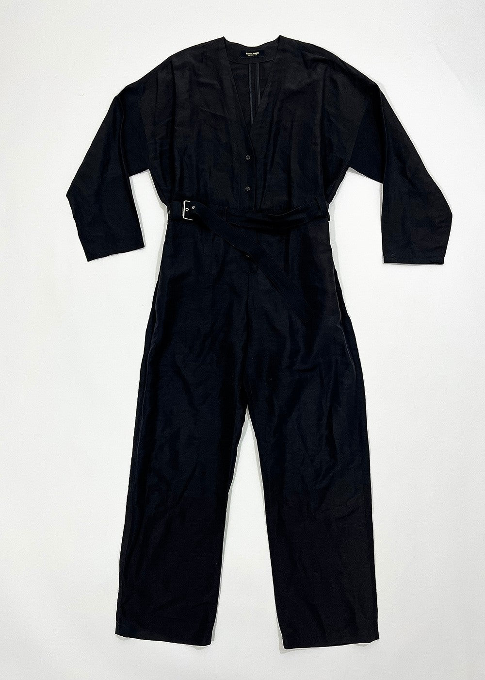 Women's loose-fitting belted jumpsuit in black by Rachel Comey.
