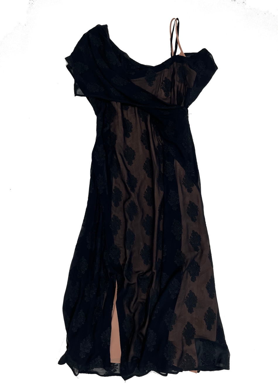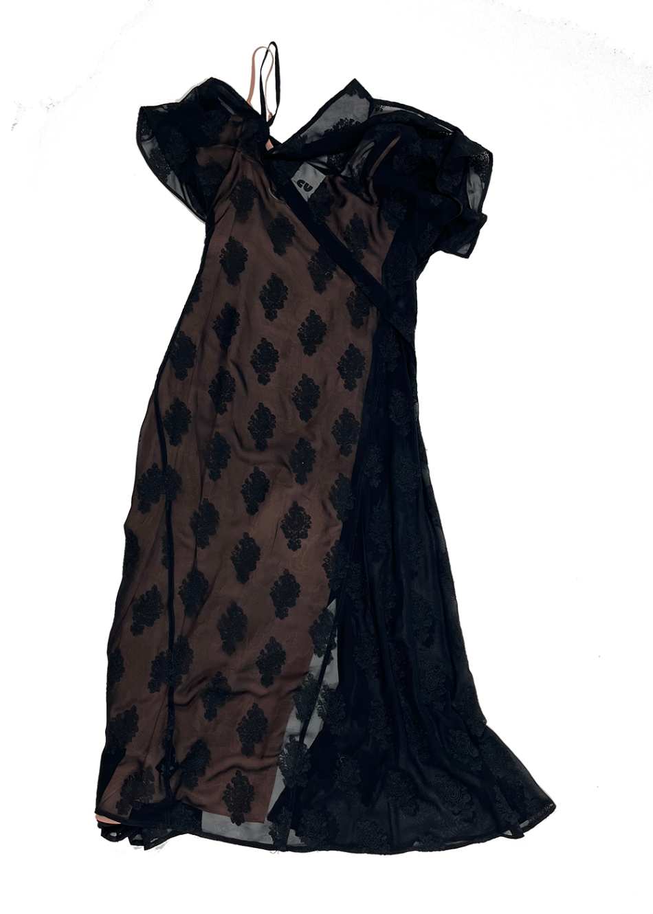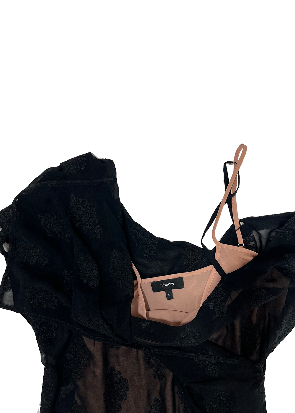 Women's silk flounce maxi dress by Theory with black overlay. Comes with nude slip.