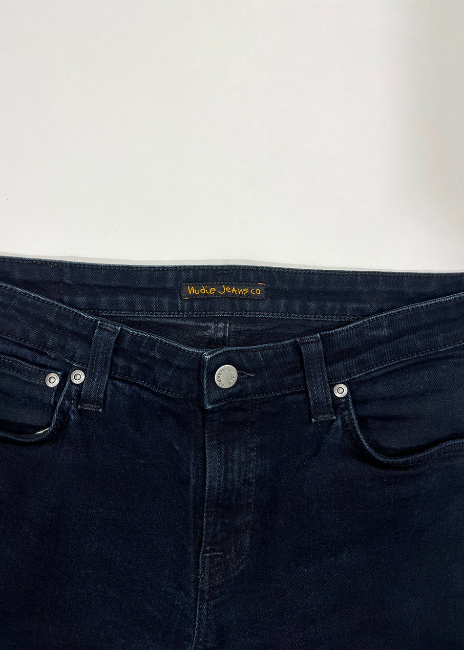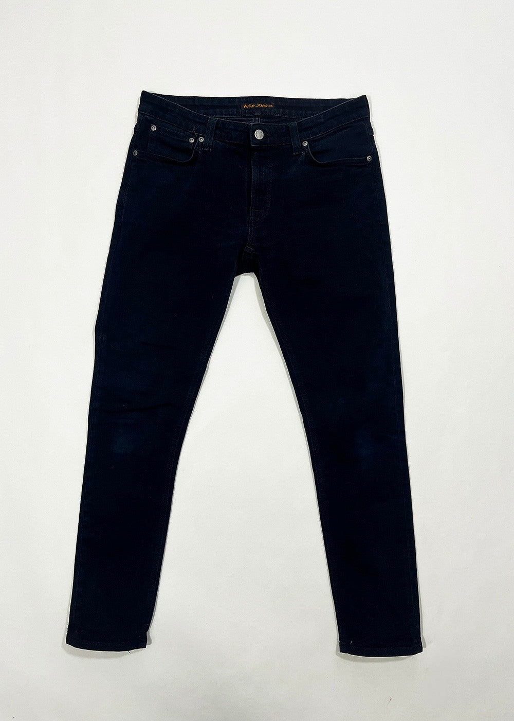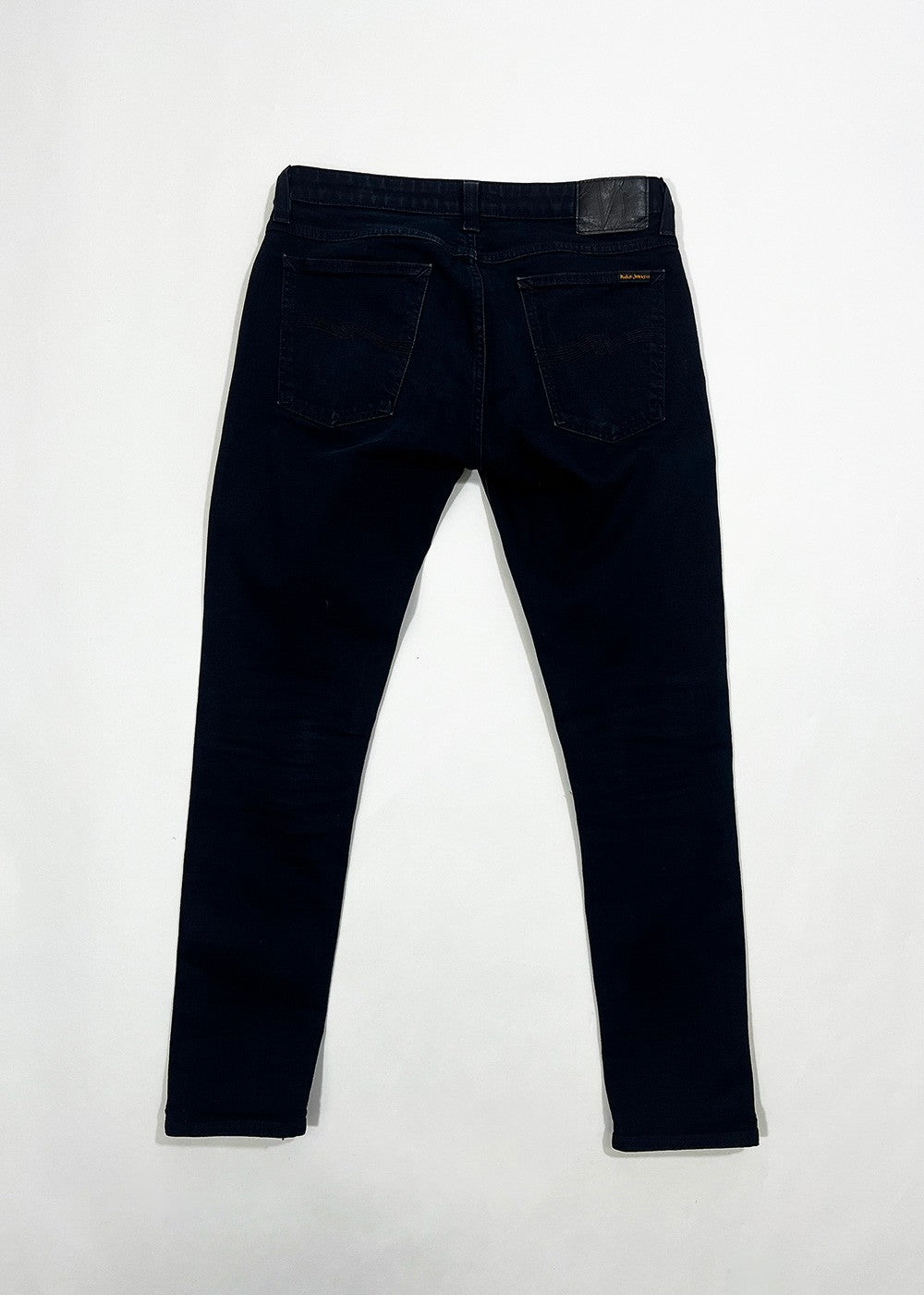 Unisex Nudie Jeans Skinny Lin jeans in black/black feature a mid rise, skinny leg and zip fly.