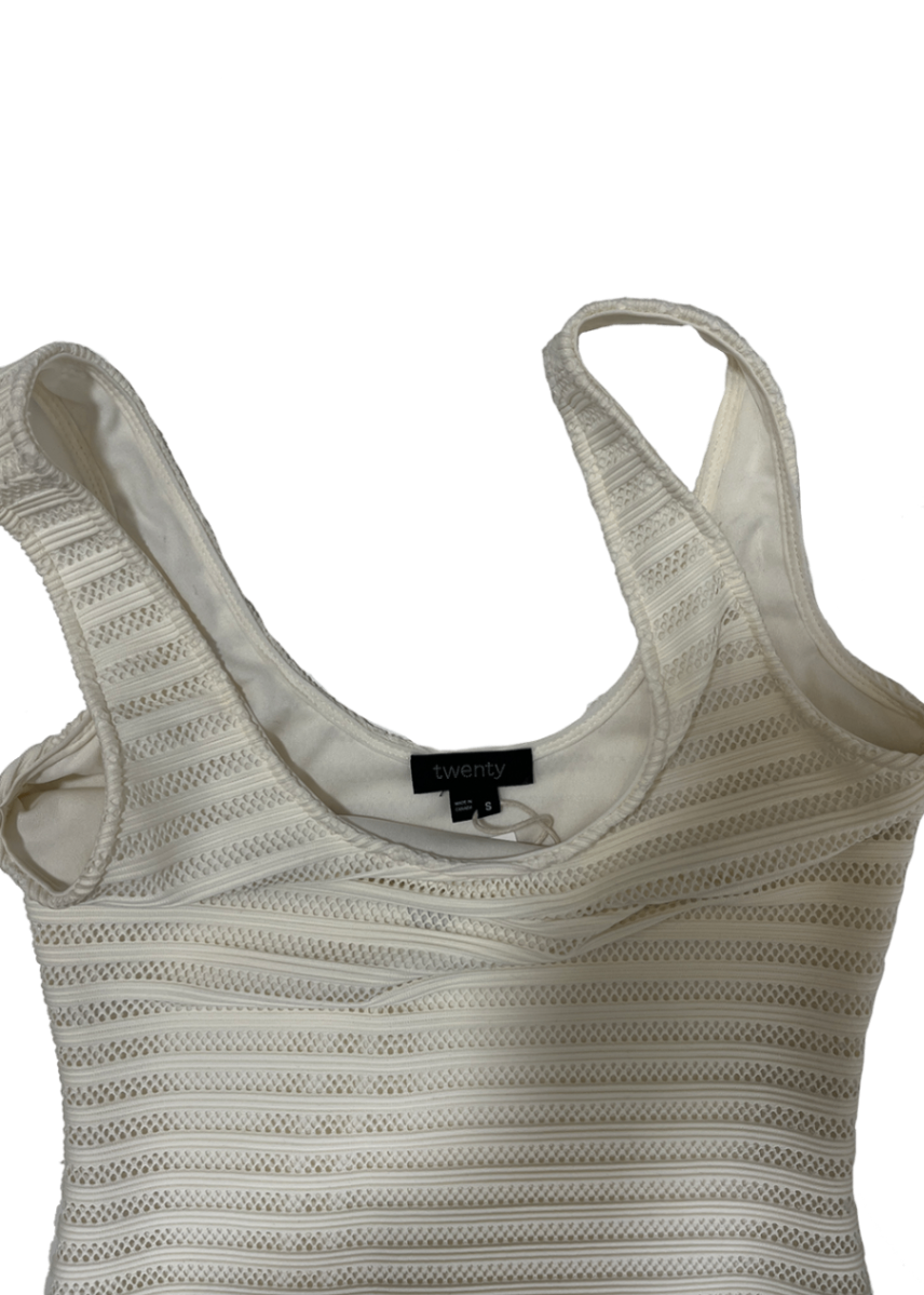 Women's sleeveless dress in white with ruffle hem, made in Canada by Twenty.