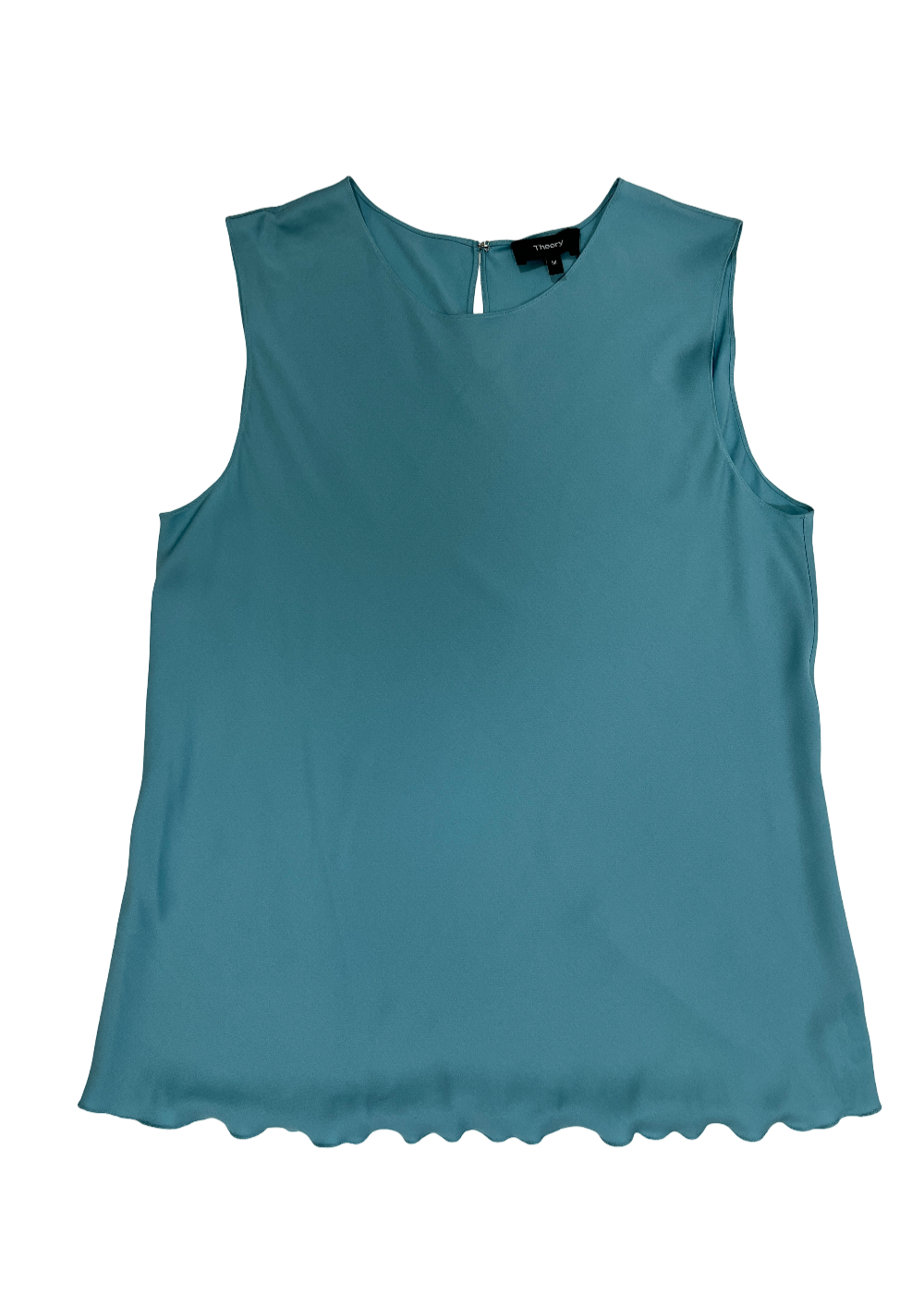 Women's sleeveless silk shell by Theory with ruffle hem detail in teal blue.