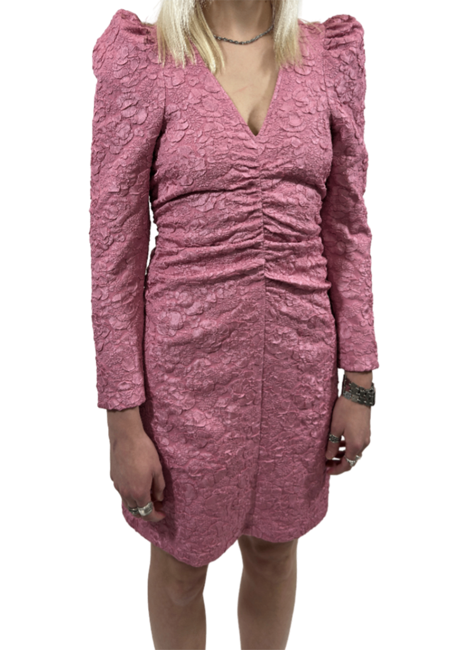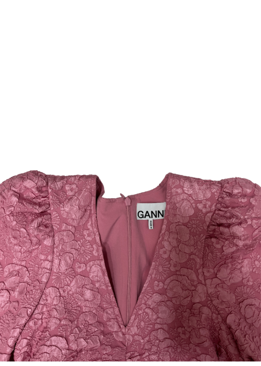 Women's v-neck mini dress in pink stretch jacquard fabric by GANNI. The dress is designed for a slim fit and features a V-neckline, long sleeves with exaggerated puff details, zip closure and ruching at the front, back and sides.