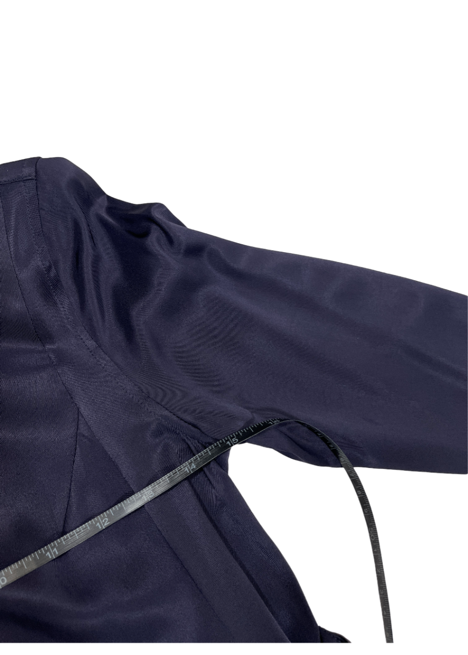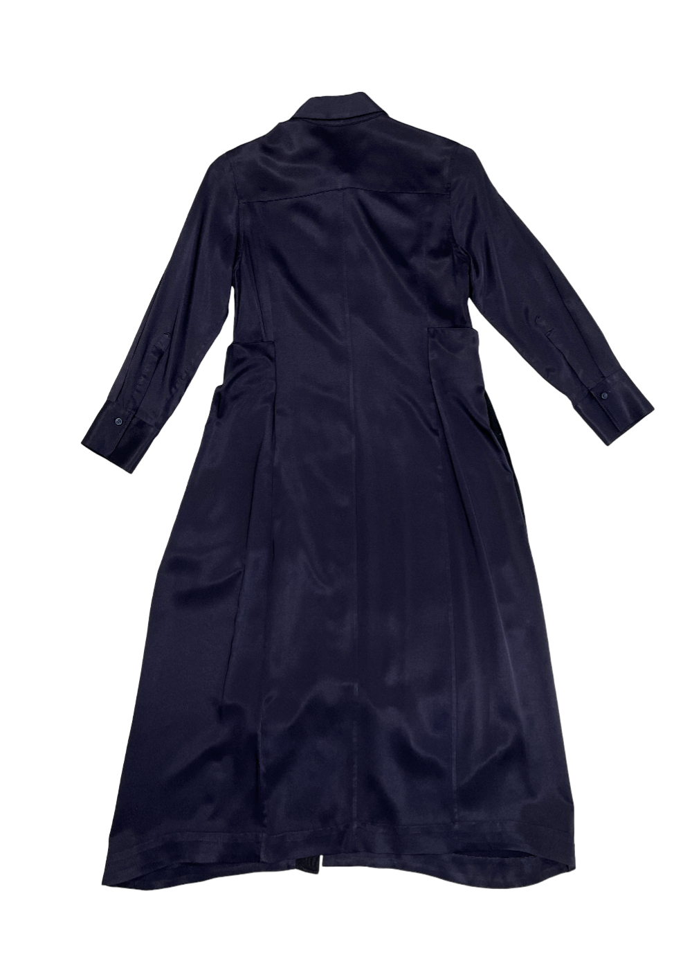 Women's navy shirt-dress in spongy viscose twill by Tiger of Sweden features a regular fit, below-knee length, long sleeves, folded placket at front with decorative grosgrain detail, folded pleat details with grosgrain drawstring at waist and cuff with button fastening.